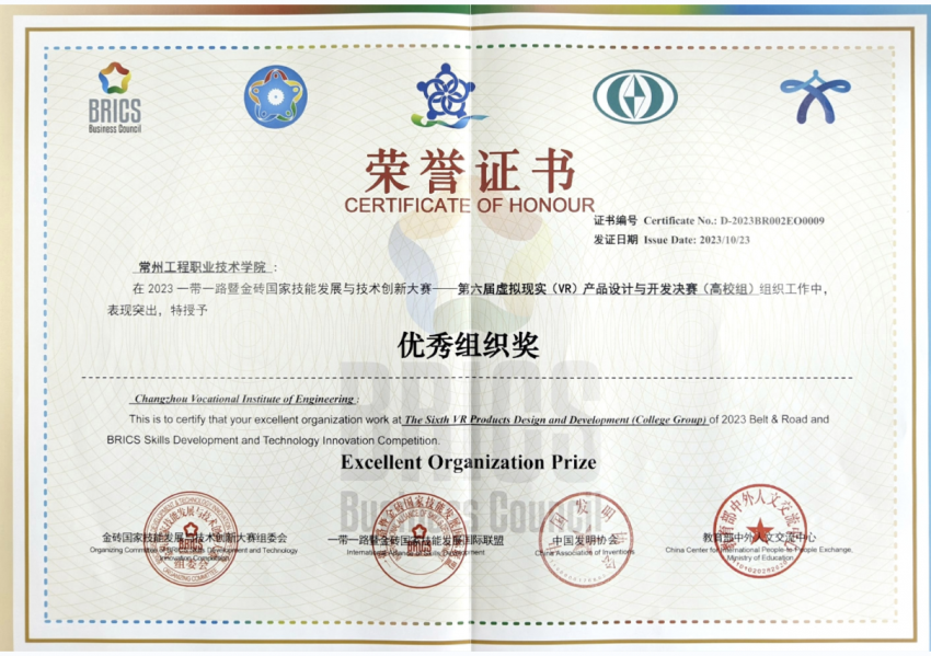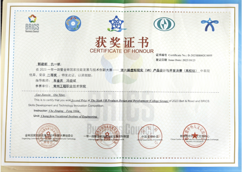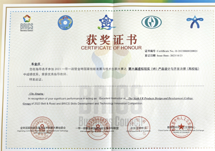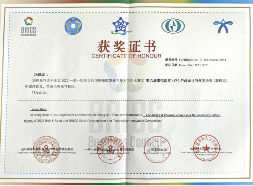 公司员工荣获2023年一带一路暨金砖国家技能发展与技术创新大赛第六届“虚拟现实(VR)产品设计与开发”赛项二等奖
