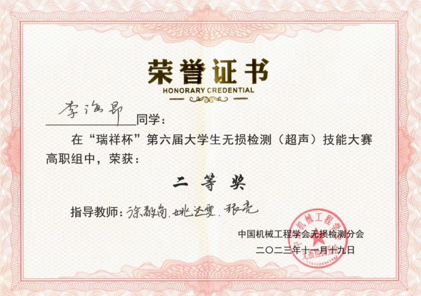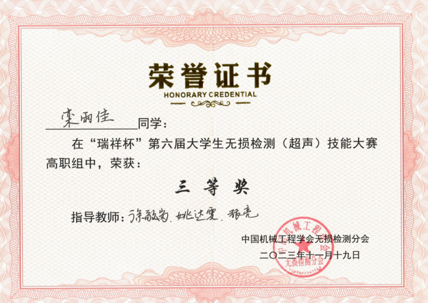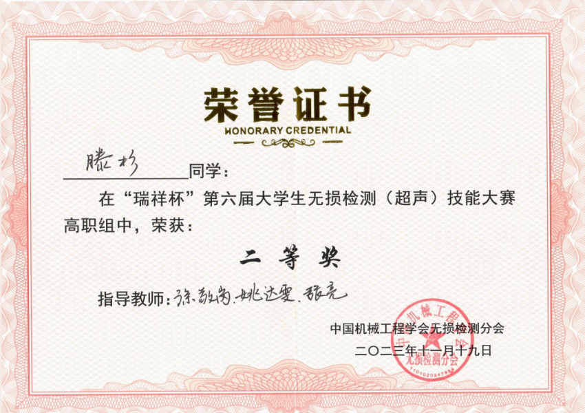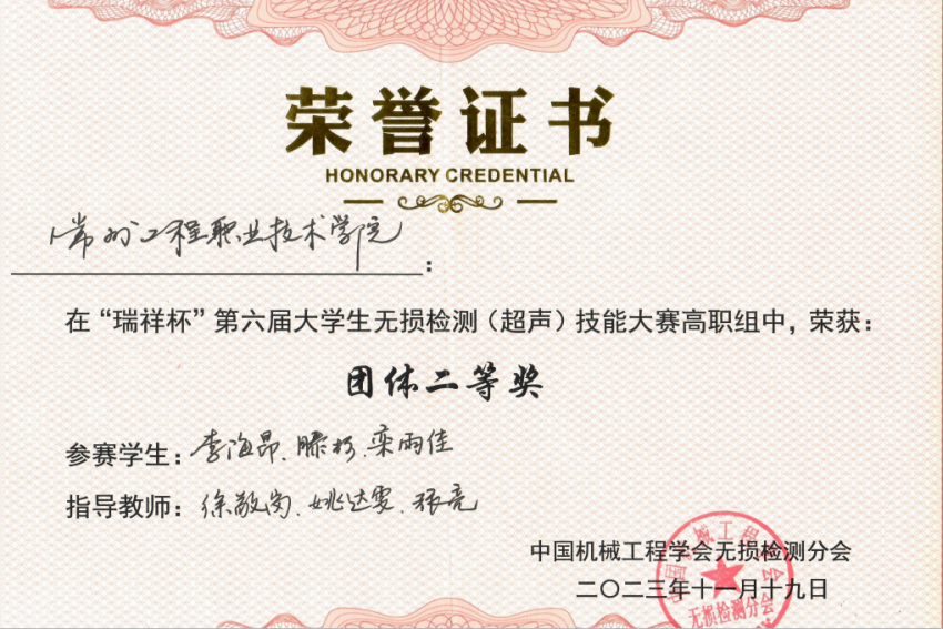 11月17日-19日,由中国机械工程学会主办的“瑞祥杯”第六届全国老员工无损检测(超声)技能大赛在西安工程大学顺利举行,来自全国各地12所本科院校和21所高职院校共计111名选手同台竞技。VSport体育、轨交装备公司理化测试与质检技术专业徐敬岗、姚达雯等老师指导的李海昂、滕杉、栾雨佳三名同学代表公司参赛,经过紧张而又激烈的角逐,最终获得个人二等奖2项、个人三等奖1项,公司荣获高职组团体二等奖。