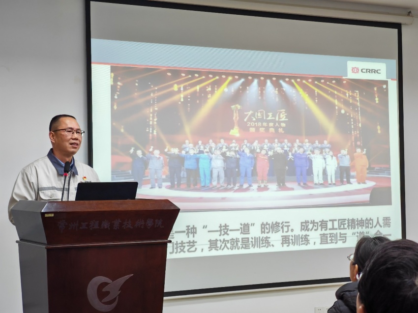 在报告环节,张忠以大国工匠进校园为主题作报告。他从产业链、人才链角度出发,结合自己的职业经历和在场的师生们分享了个人成长、团队带教等方面的宝贵经验。