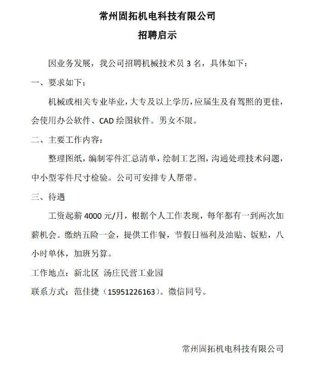 20240010常州固拓机电科技有限公司招聘信息