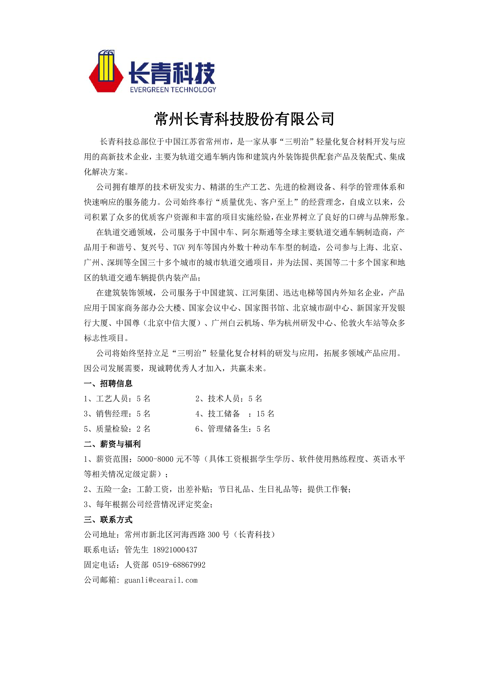 20250018常州长青科技股份有限公司招聘信息