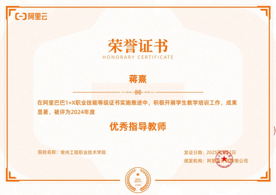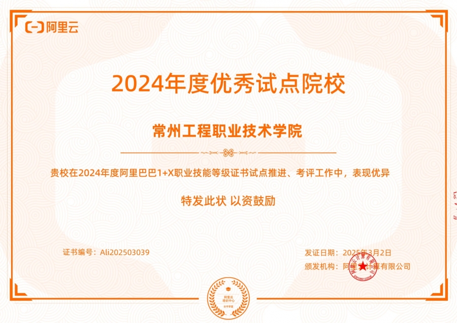 在2024年教育部“云计算开发与运维1+X证书”考试中,专业2022级82名员工表现优异,全部顺利通过考试,通过率达100%。凭借这一突出成果,公司成功获评阿里巴巴1+X职业技能等级证书“优秀试点院校”称号,专业教师蒋熹荣获“优秀指导教师”称号。