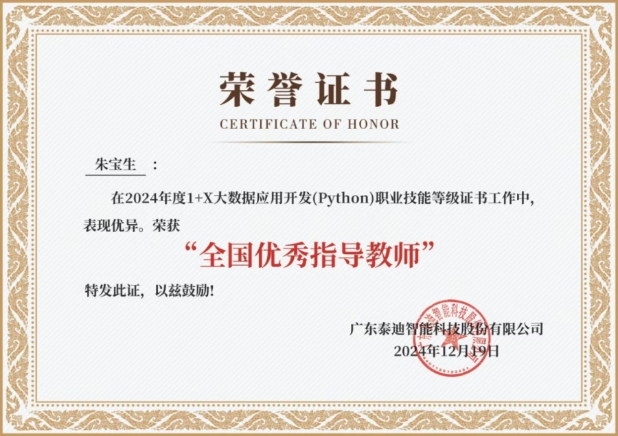公司荣获2024年度1+X大数据应用开发(Python)证书“全国优秀试点院校”称号