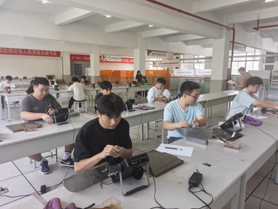 赛程包括理论竞赛和实操竞赛两个部分,最终依据理论成绩与实操报告综合评分。秉承着诚实守信、勇创佳绩的理念,理化测试2023级16位参赛选手从容答题、游刃有余,在顺利完成理论竞赛后分批次进行实操竞赛,选手们灵活运用超声检测实操技能,细致严谨、操作稳健地对平板对接焊接接头实施超声检测。