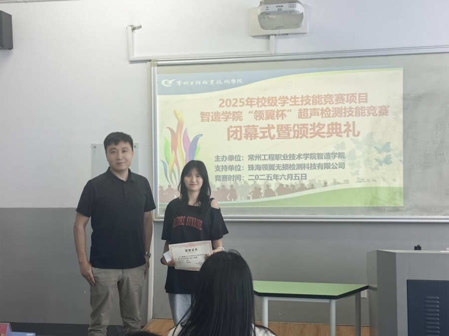 经过紧张而有序的比赛,所有的奖项均已产生,在竞赛闭幕式暨颁奖典礼上,任卫东为三等奖选手王焕磊、徐海涛、胥又文颁奖;徐敬岗为二等奖选手徐吉星、庄苏诚颁奖;黄辉为一等奖选手邰盼萍颁奖。最后徐敬岗发表讲话,对所有参赛选手提出了在专业学习和职业发展中的期盼和希望。至此,VSport体育“领翼杯”超声检测技能竞赛圆满落下帷幕。