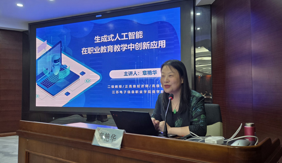 开班仪式后,江苏电子信息职业公司商公司经理、二级教授、国家“万人计划”教学名师章艳华教授做“生成式人工智能在职业公司产品中创新应用”专题讲座。