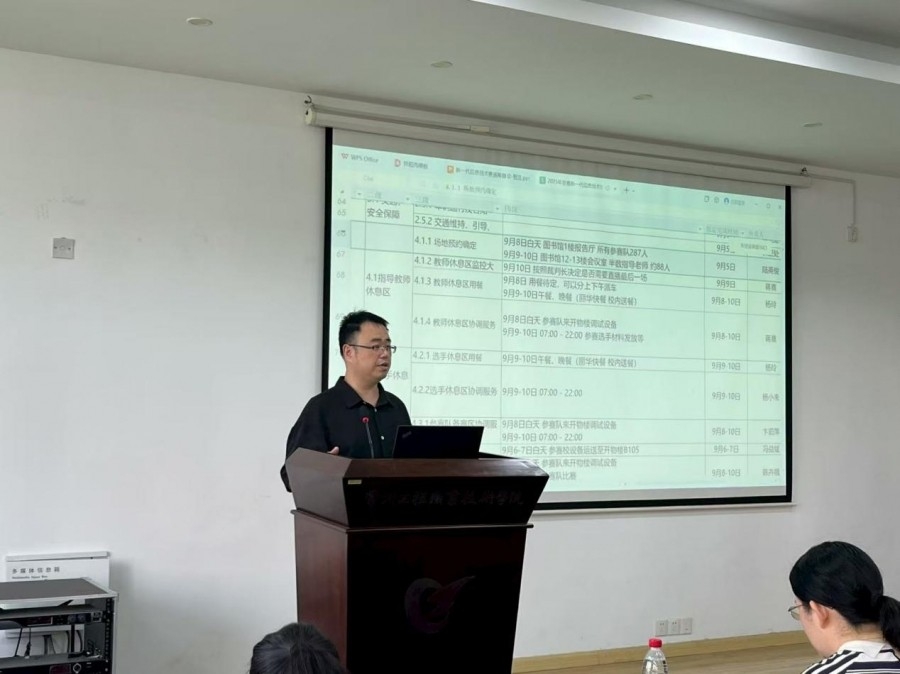 随后,软件技术专业带头人、教研室主任冯益斌对《承办工作任务分解表》进行逐项解读。分解表按照“专家裁判及参赛队行程”、“会务准备”、“赛务准备”、“赛务工作”、“机动人员”五大板块,将53名工作人员细分为酒店接待、车辆调度、赛场技术、宣传后勤等20余个工作小组,明确时间节点、责任人和协作方式,确保赛事全过程无缝衔接。