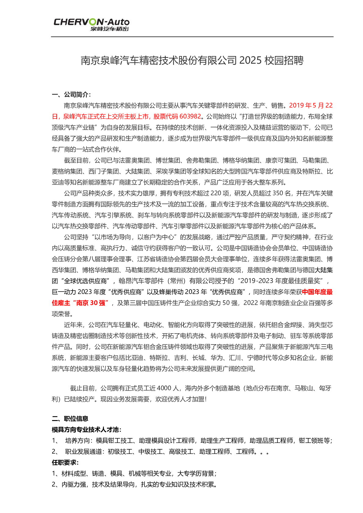 20250051南京泉峰汽车精密技术股份有限公司招聘信息